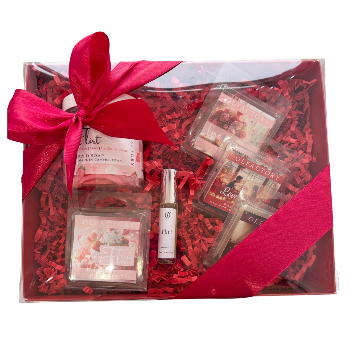 Each box contains 10ml Flirt Perfume, a luxuriously soft Flirt Whipped Soap, and four irresistible wax melts in Flirt, Love in Bloom, Love Struck, and The Temptress. A complete scent wardrobe in one beautifully curated box.